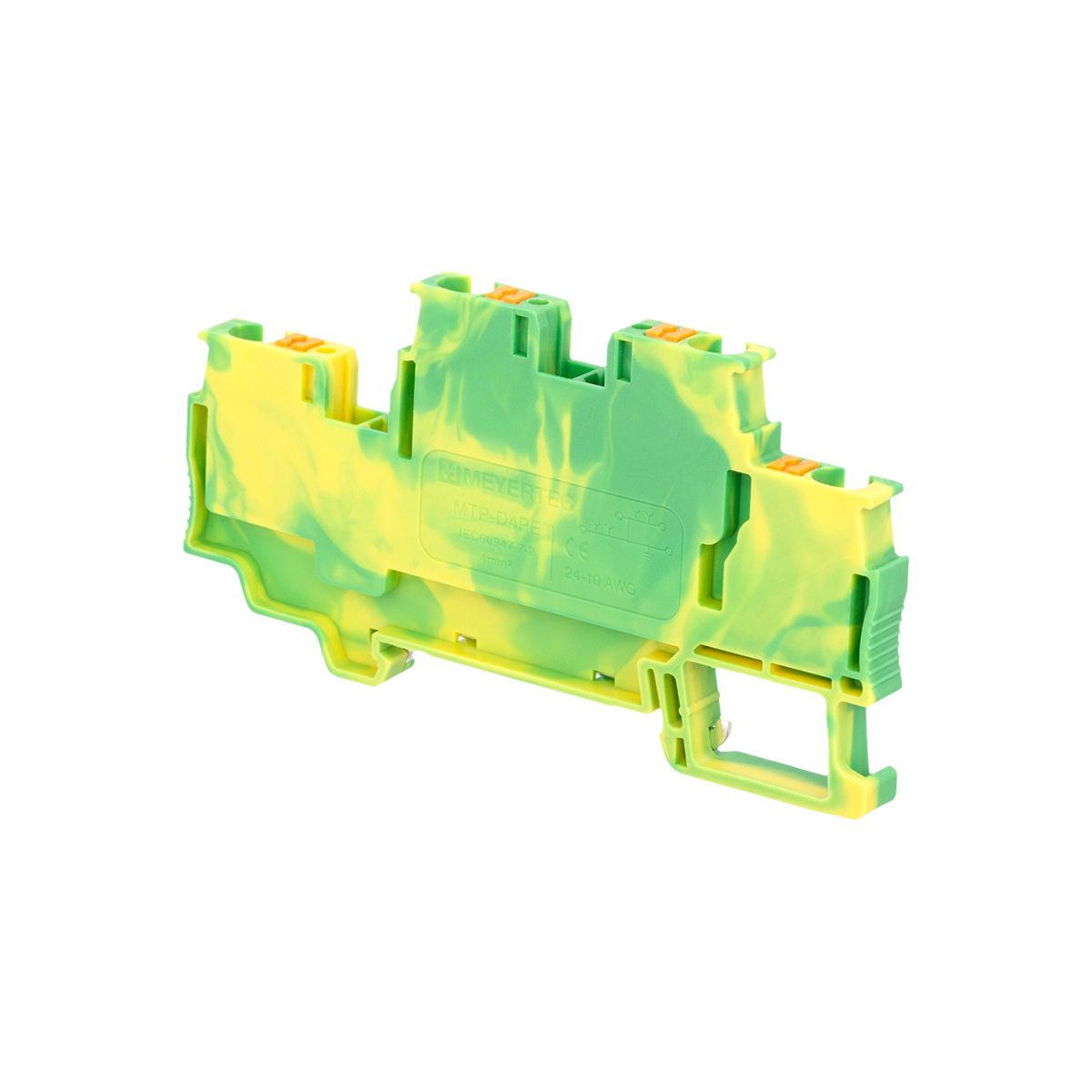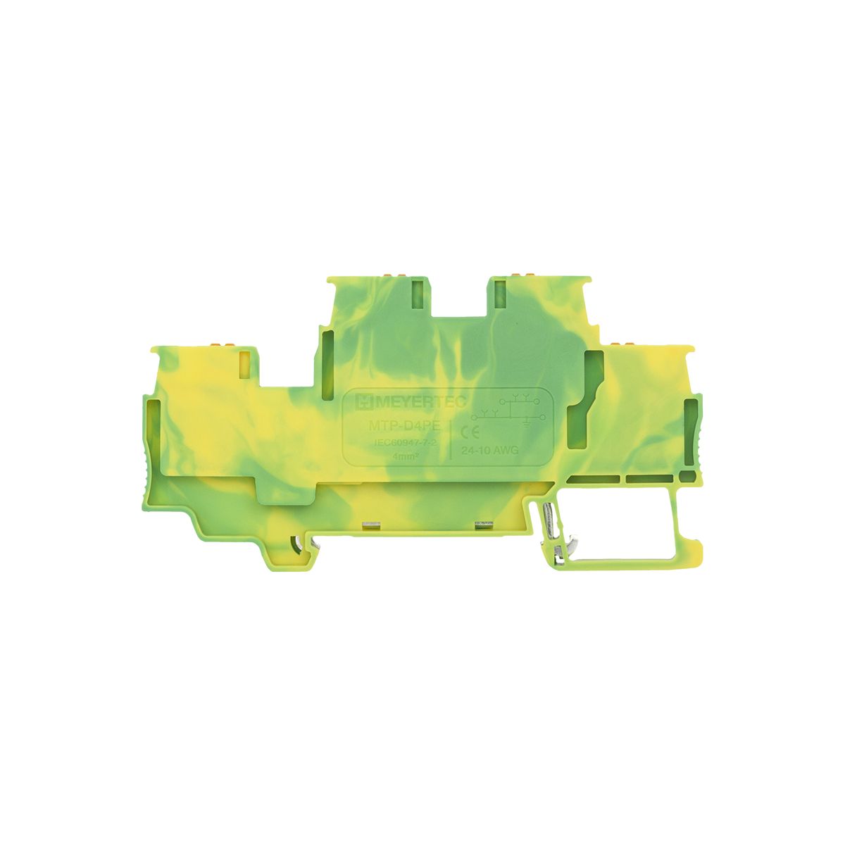 Заземляющие двухуровневые push-in клеммы MTP-D4PE применяются для подключения защитных заземляющих проводников. Клемма фиксируется на DIN-рейке простым защелкиванием без использования инструментов.