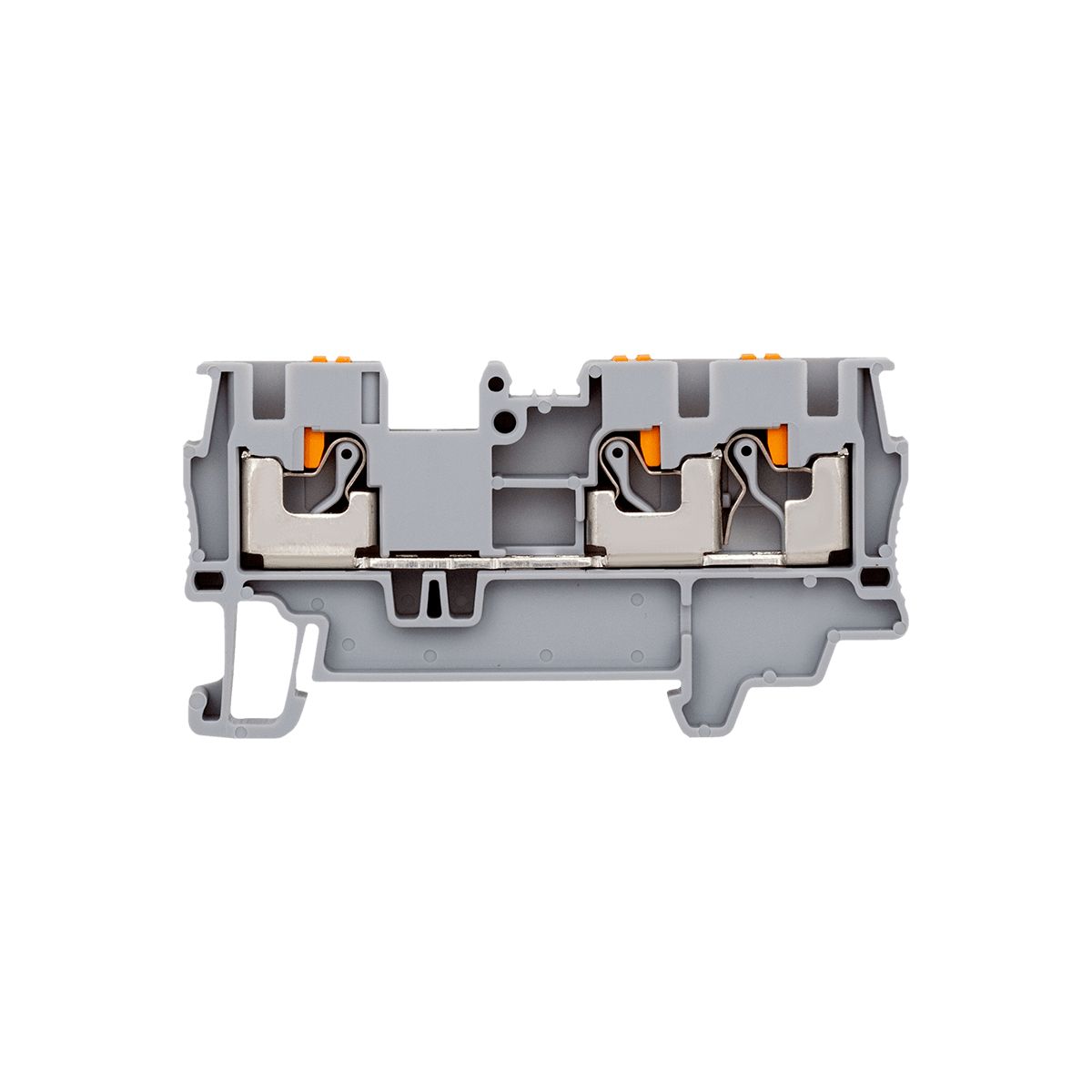 Трехпроводные push-in клеммы MTP-TO2.5 применяются для разветвления токовых цепей. В отличие от многоуровневых клемм данные клеммы имеют единую токопроводящую шину на 3 присоединения.