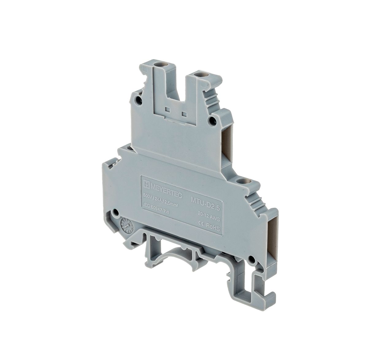 Двухуровневые винтовые клеммы MTU-D2.5 применяются в шкафах автоматики с высокой плотностью монтажа при ограниченном пространстве. Двухуровневые клеммы экономят до 50 % монтажного пространства на DIN-рейке по сравнению с одноуровневыми клеммами. Верхний уровень имеет канал для установки перемычек.