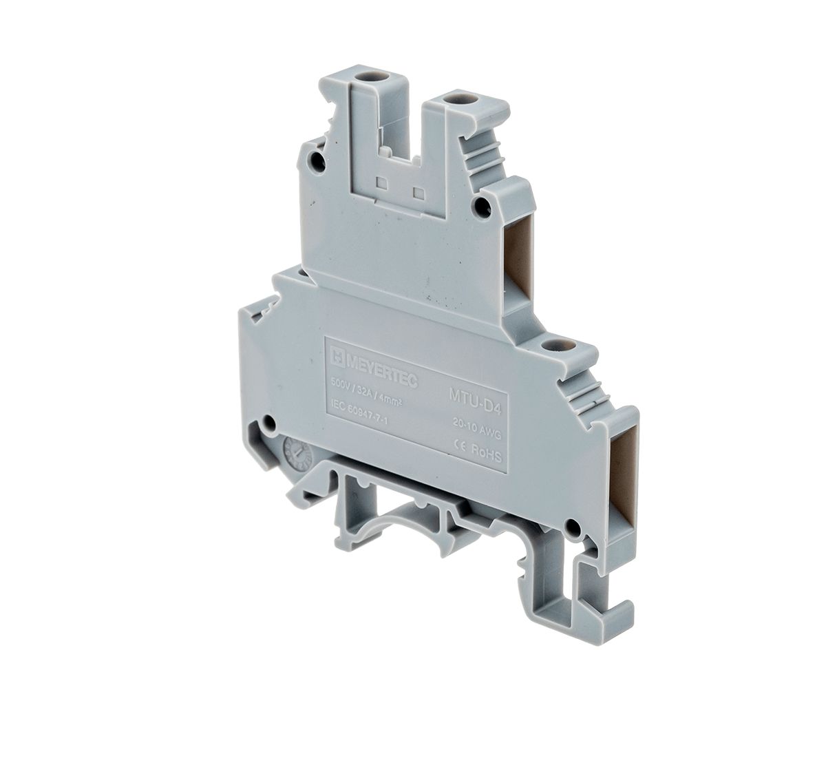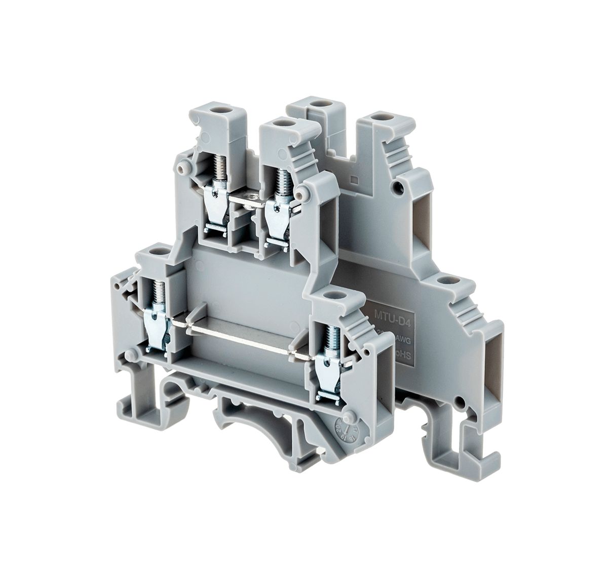 Двухуровневые винтовые клеммы MTU-D4 применяются в шкафах автоматики с высокой плотностью монтажа при ограниченном пространстве. Двухуровневые клеммы экономят до 50 % монтажного пространства на DIN-рейке по сравнению с одноуровневыми клеммами. Верхний уровень имеет канал для установки перемычек.