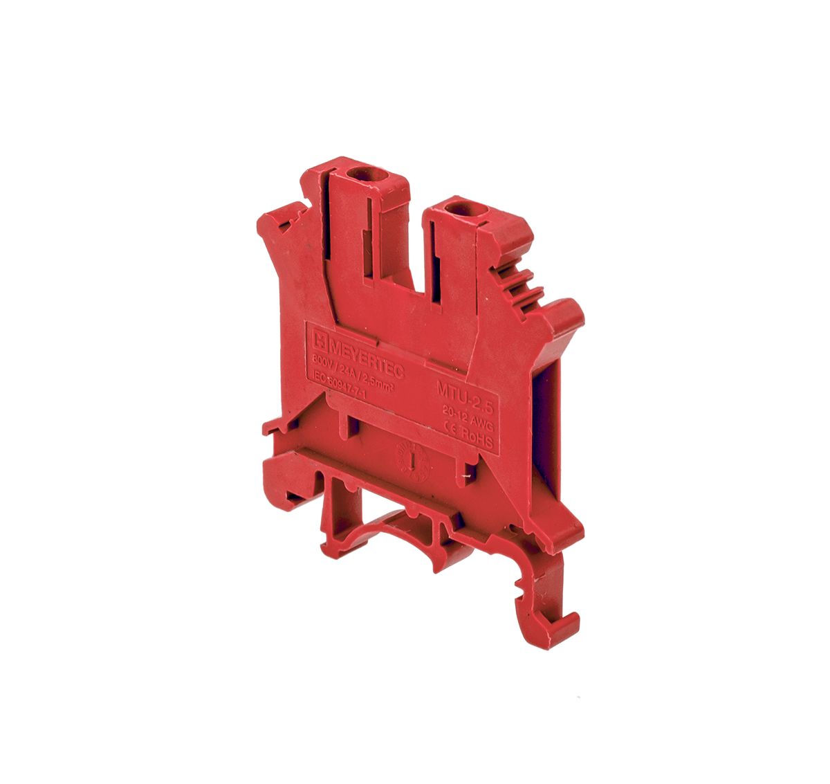 Одноуровневые винтовые клеммы MTU-2.5RD – простой и удобный способ подключения устройств в шкафах автоматики. Клеммы MTU-2.5 предназначены для проводников сечением 2,5мм2. Открытую токопроводящую часть клеммного ряда необходимо закрыть торцевой заглушкой. Одноуровневые клеммы имеют одинаковые габаритные размеры для всех сечений, кроме ширины, которая зависит от сечения выбираемого проводника.