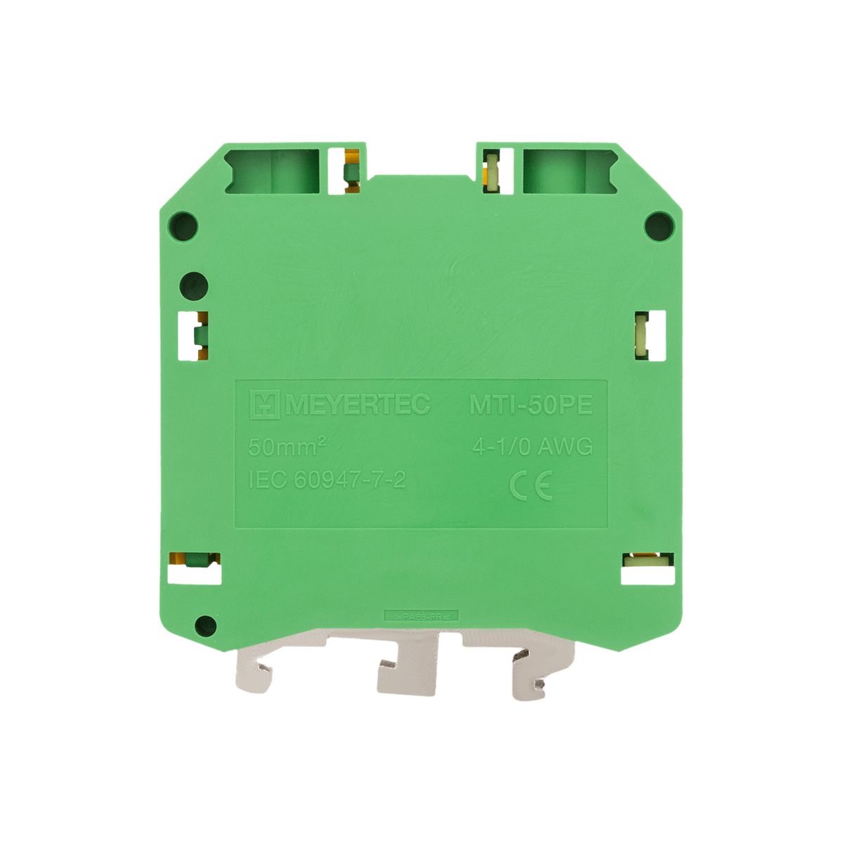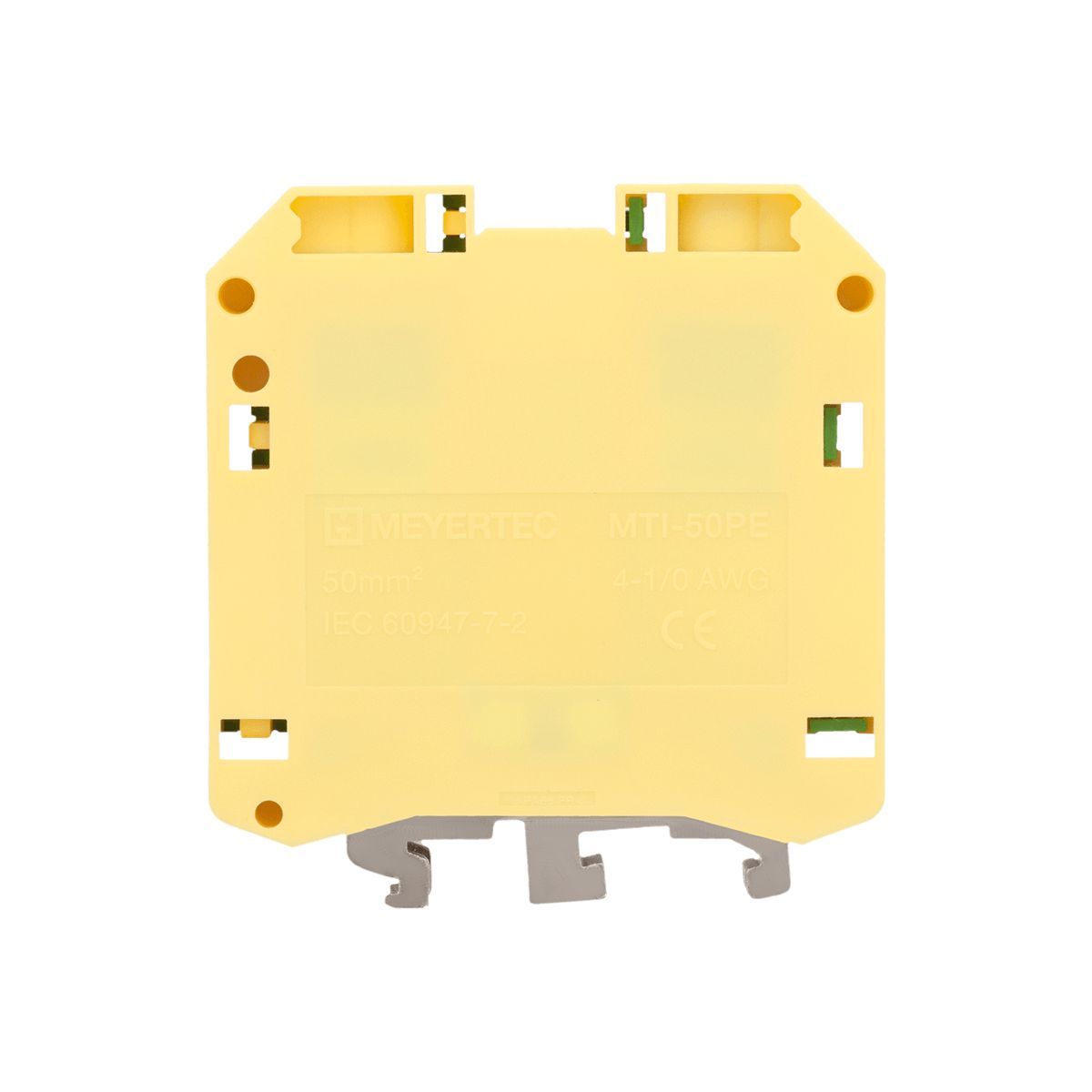Клеммы «Земля» MTU-50PE обеспечивают заземление проводников благодаря контакту токоведущей шины с DIN-рейкой (при условии заземления монтажной пластины шкафа).