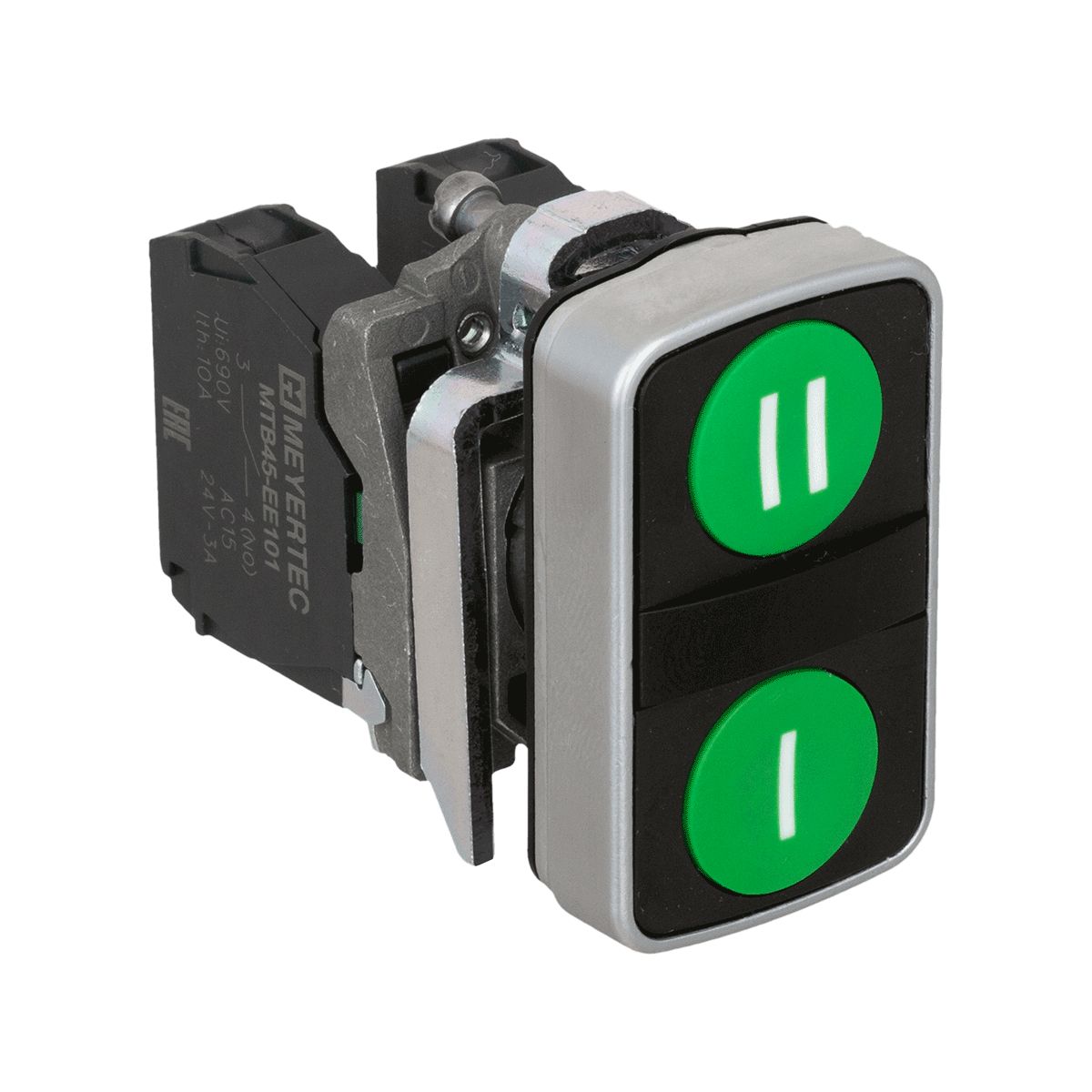 Кнопка двойная плоская, зеленая, маркировка "I+II", 2NO, IP65, металл