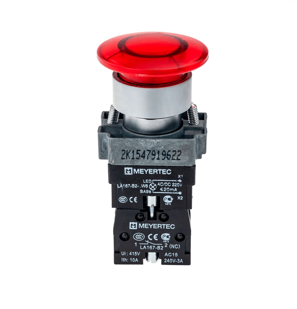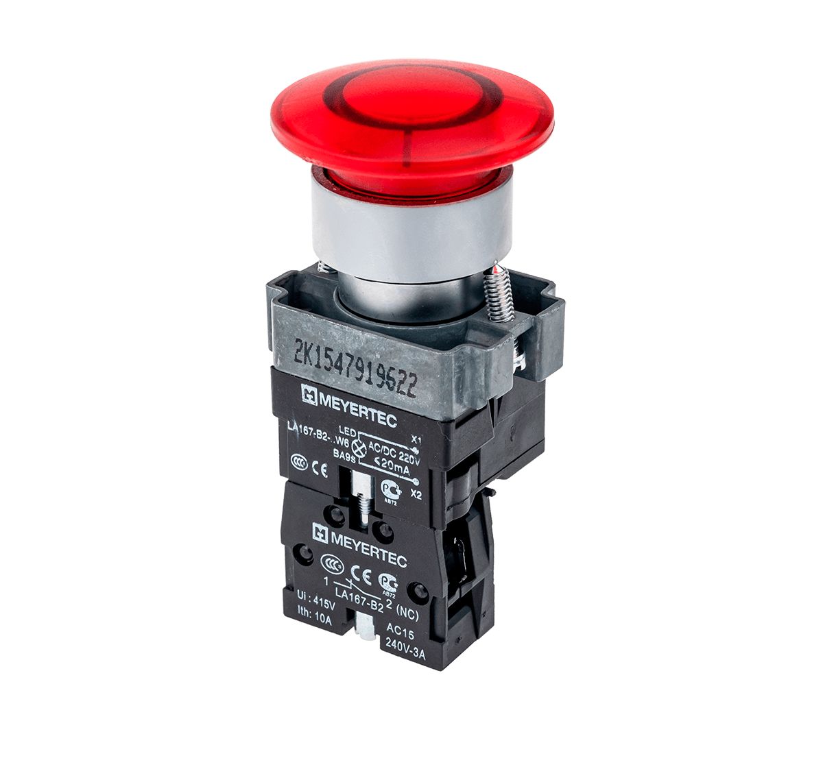 Кнопка грибовидная без фиксации, с подсветкой, 220V, 1NC, красный
