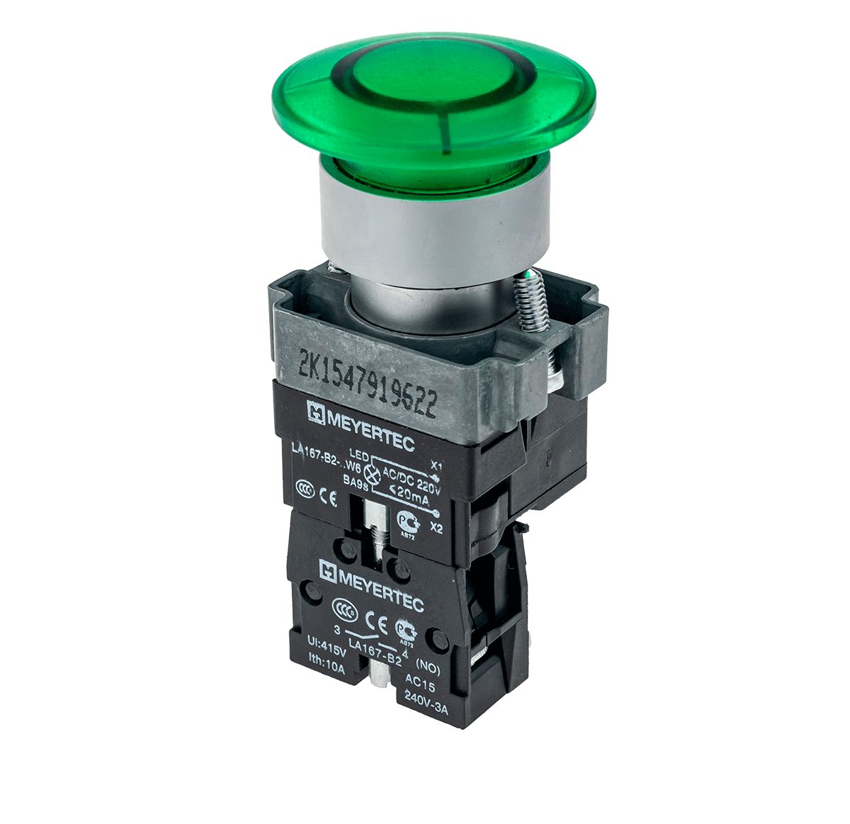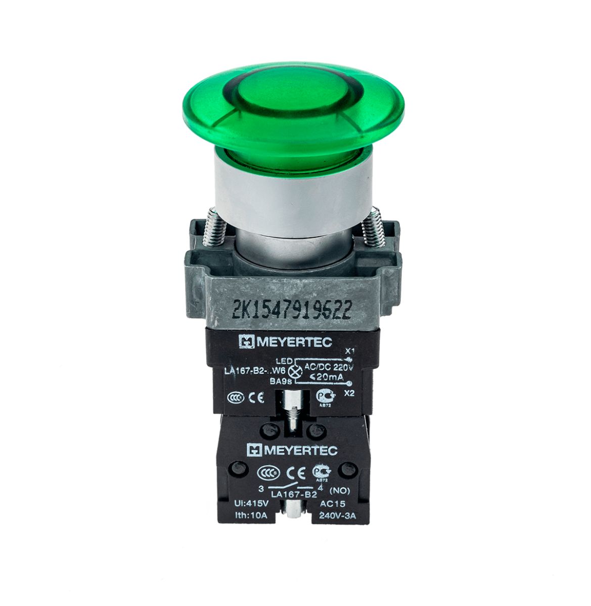 Кнопка грибовидная без фиксации, с подсветкой, 220V, 1NO, зеленый