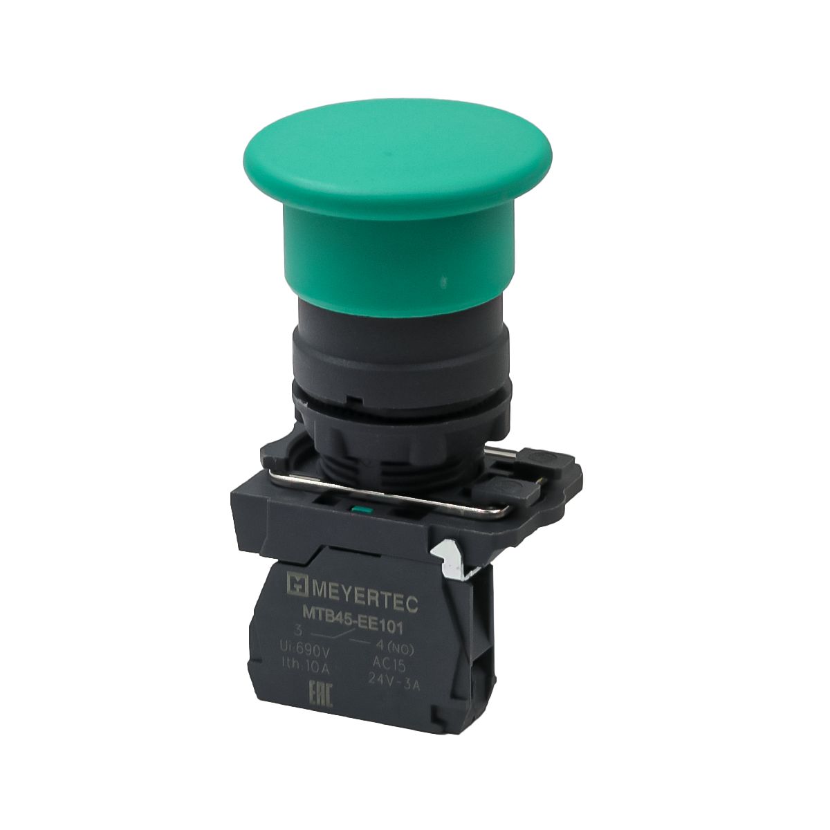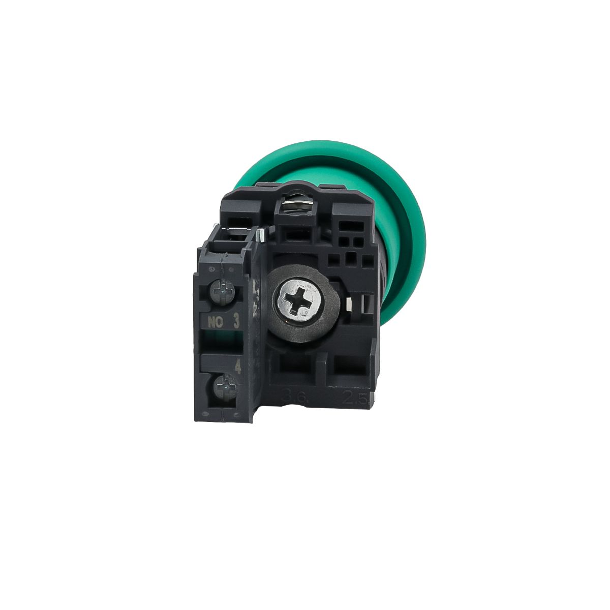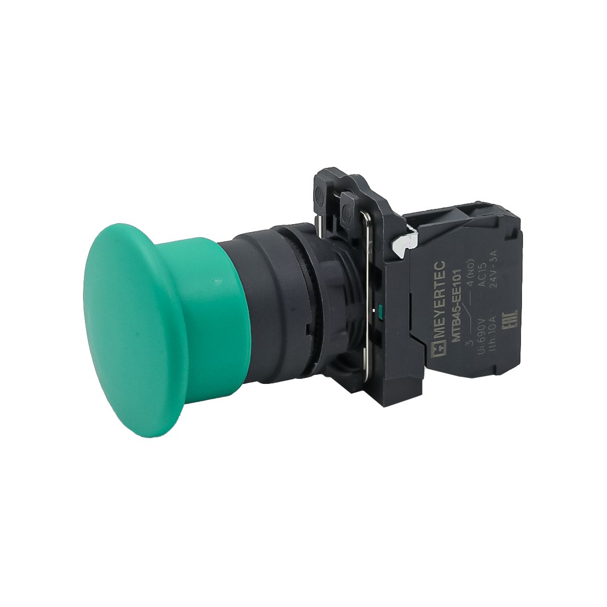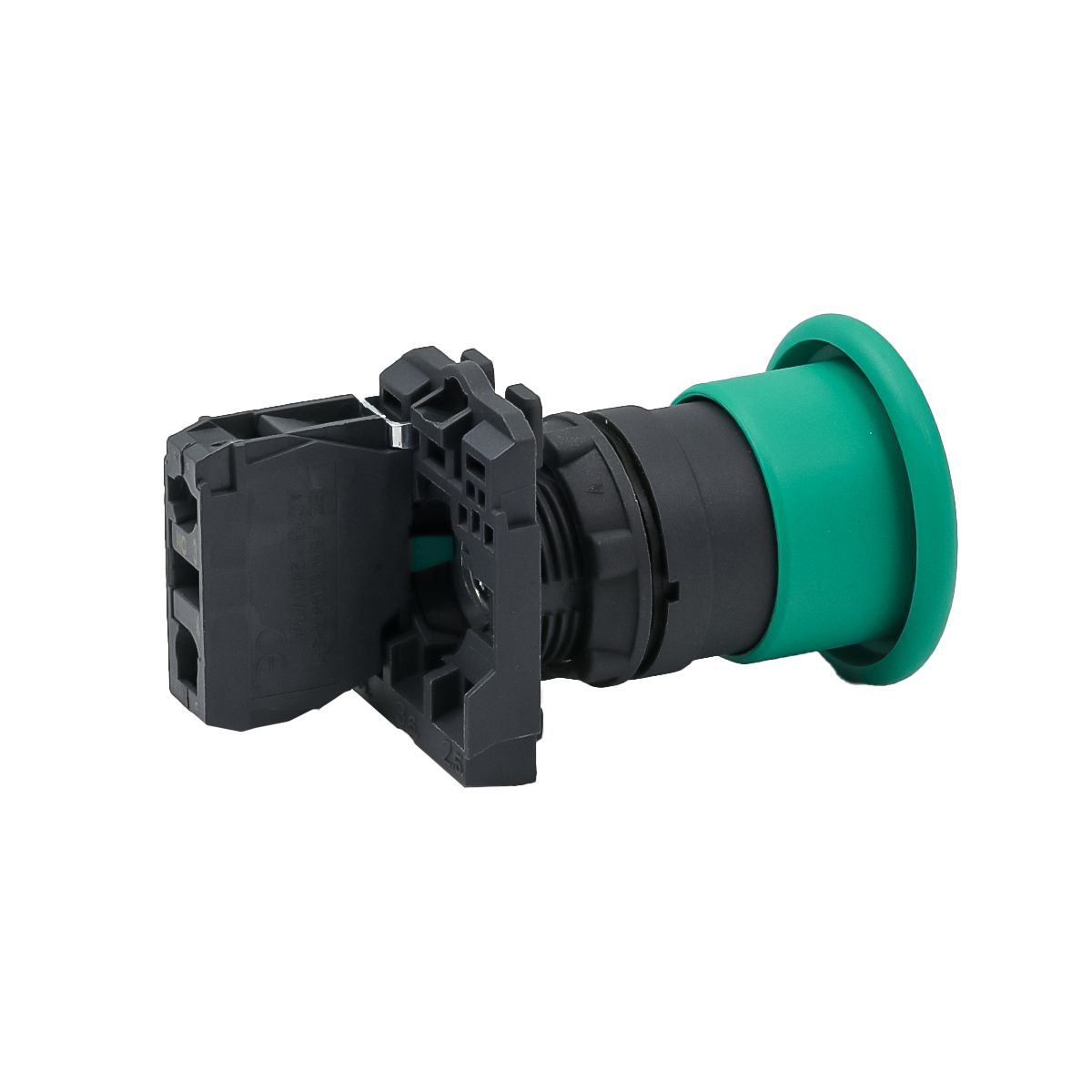 Кнопка грибовидная зеленая, 40 мм, пружинный возврат, 1NO, IP65, пластик