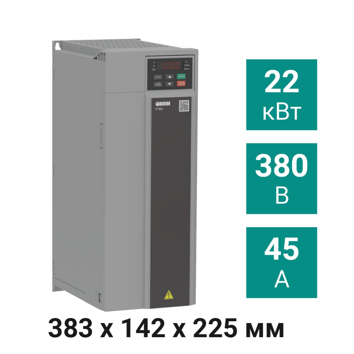 Преобразователь частоты ПЧВ3-22К-В [М01] предназначен для управления электродвигателями мощностью 22,0 кВт. Номинальный выходной ток – 45,0 А, использует трехфазный источник питания переменного напряжения 380 В.