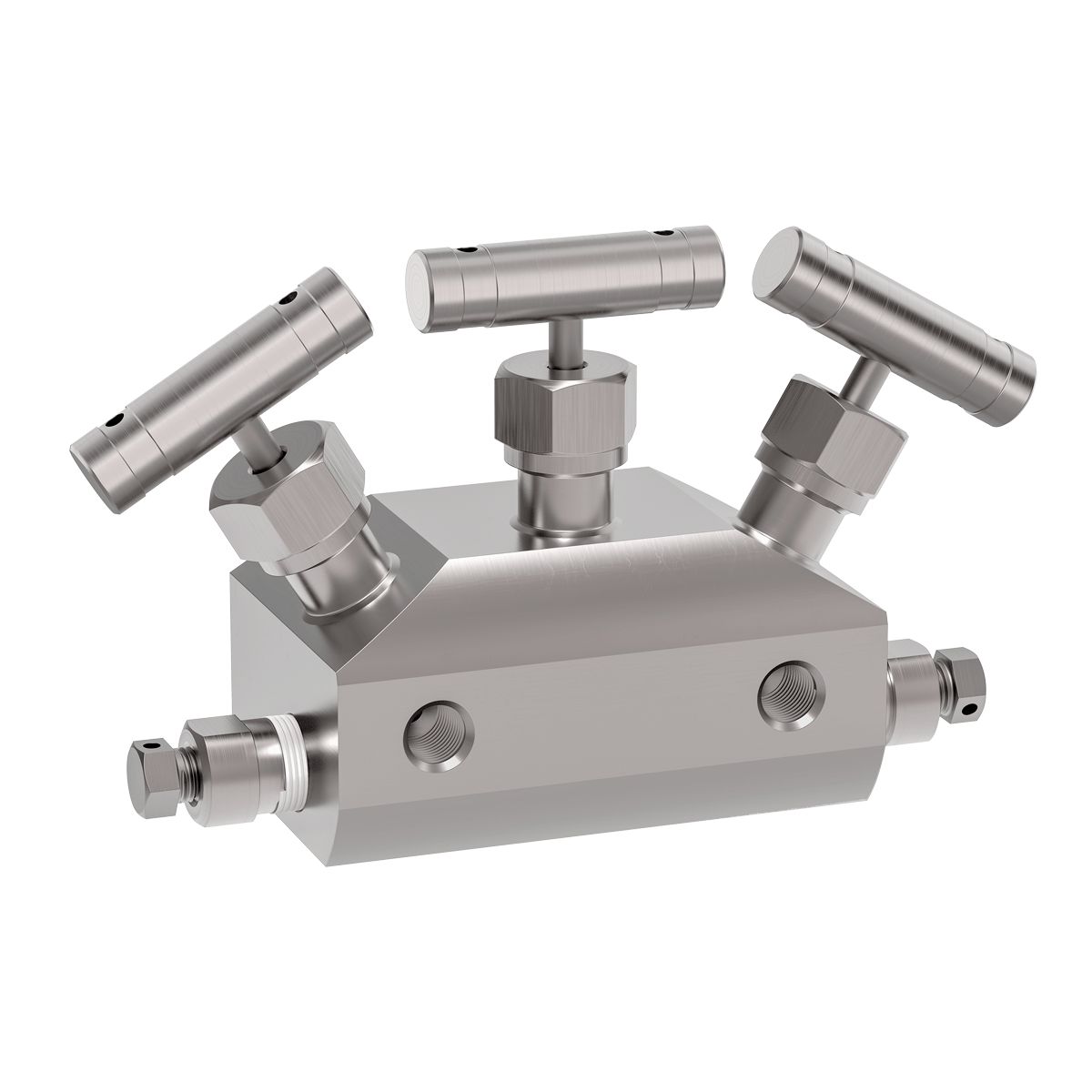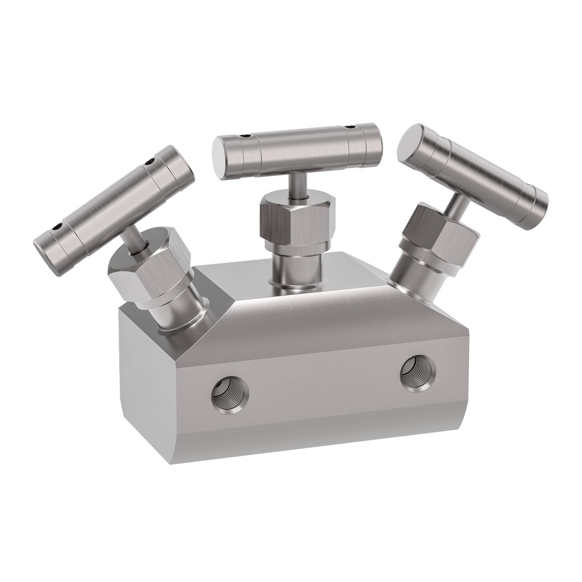 - Блок трёхвентильный БВЭ-302Н.40 – два измерительных канала для соединения с процессом, и на каждом канале по одному вентилю, перекрывающему канал от датчика к процессу. Третий (средний) вентиль объединяет два канала между собой и служит для корректировки нуля на датчике дифференциального давления. Имеются два дренажных канала, перекрытых игольчатыми болтами.